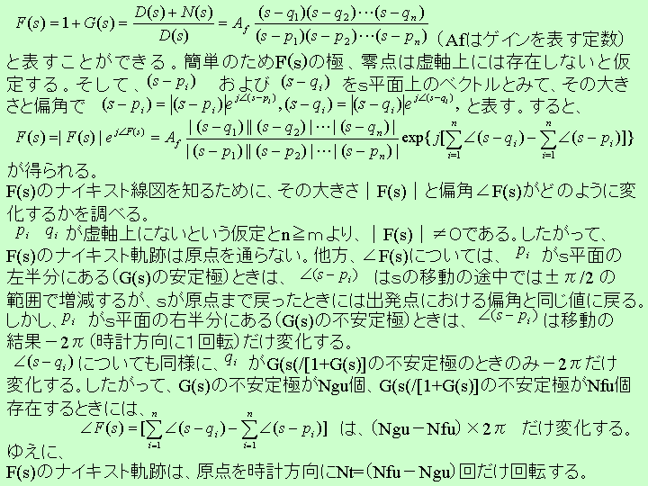 一巡伝達関数G(s)はプロパーな有利関数であるとす る。G(s)の不 安定極の個数を(k重極はk個と数えて)Nguとし、G(s)のナイキスト線図が点-1+j0を時計方向に回る回数をNtとする。このとき、フィードバック系が安定であるための必要十分条件はNgu + Nt =0 となることであ る。