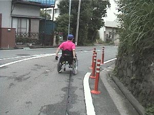 動く歩道は便利?ずっと平らならいいけれど・・。途中で上り坂になっていて進まなくなってしまい、たすけてもらいました。ありがとうございます。 歩道のない道はとってもこわいです。 段差をなくしてある歩道