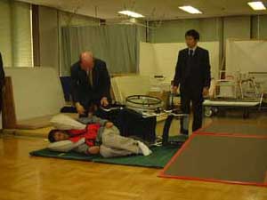 車いすにのっている人が転んだら大けがです。けがをすくなくするように、エアバッグがふくらんで体を守ります。