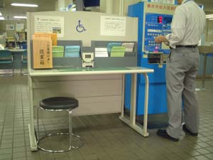 書類を記入する低いテーブル。区民からの意見を入れるポストもあります。でも、用紙がないぞ〜!