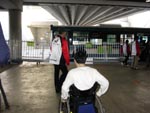 乗務員の介助で、試乗会場行きの送迎バスに乗り込む。