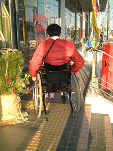 昨年(03)に続いて、今年も門松がスロープと点字ブロックをブロック。 車いす使用者は階段側によけなければいけないので、こわいです。