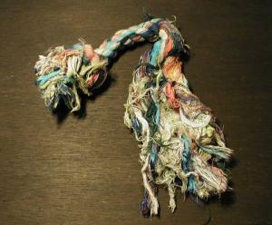 長持ち度:★★★ これはいったい何代目コットンになるのか…。 すぐにほどかれないよう、今回は超特大を購入。 さすがに、速攻破壊はなかったが、ぶるんぶるん振り回して危ないし、 大きいため、床にうちつけると、騒音もそれなり。 迷惑を考え、小出しにしていたのだが、とうとうこのありさま。 もったいないので、しばらく使ってみたが、 ボロボロの残骸をアンドウが食べるので撤収。