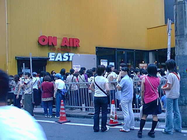 例によって入り口はファンクラブ用と一般用が別れています。ホールツアーの時はファンクラブが90%くらいのようでしたが、今日はファンクラブ会員の方が少ないようです。夏のイベントというのはそういう傾向になるのでしょうか。(FC会員を優先的に入れるのではなくて、お楽しみ抽選券を配るためです。まあホールツアーでは、あの数ではかえって全然優先になっていないですね。一般の方がすぐに入れましたよ。)