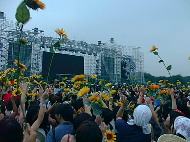 いよいよ、メンバー登場。1曲目はこれではないかと予想した曲、「ヒマワリ」でした。やった、出ました!前回ツアーではなかったので残念だと思っていたところです。夏のイベントということで必ず出るとは思っていましたし、1曲目とかいいなと思っていたところです。たぶん、来ているお客さんもそういう思いの人が多かったことでしょう。一面のひまわり畑、圧巻です。きれいです。beautiful!客席側からですが写真をご覧下さい。あとでVoの松岡君が「ええもん見してもろうた。老後の楽しみに.....」と評していましたが、ステージから見るとほんとにきれいだったことでしょう。Videoでも発売されたら是非購入してステージからのひまわりを見たいです。