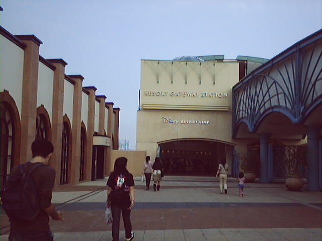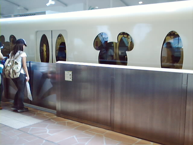 リゾートへの入り口、リゾートゲートウエイステイションとネズミ型の窓をした電車の車両。