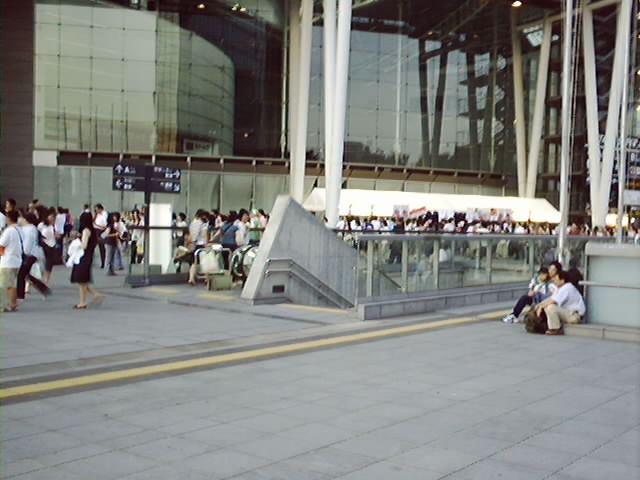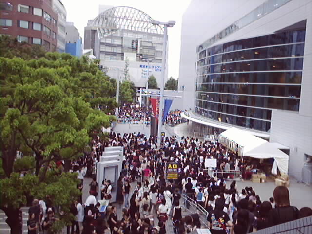 来場者のほとんどは女性です。赤いチェックのミニスカートをはいている人多数。バックにHydeistの文字。これはグッズなのだろうか。場外で売っているコンサートグッズを見てみましたがありません。どうやら、ファンクラブで販売したものの模様。これをはいている♂も一人。ファンクラブ会員に少なからず男性もいる模様。