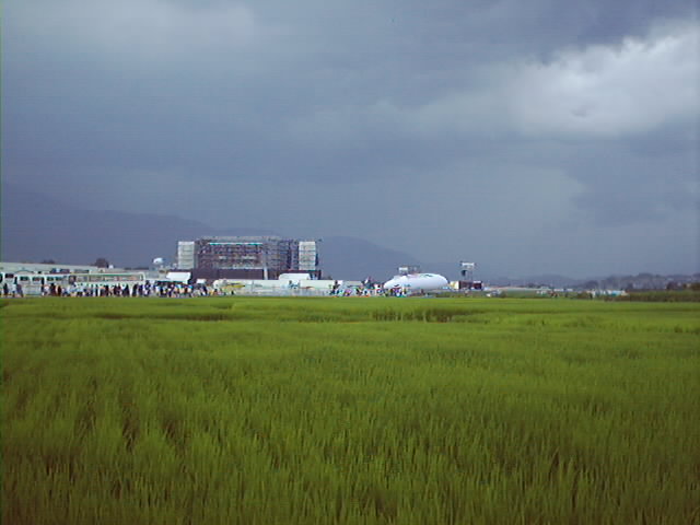 上空雲行きが怪しくなりました。強風も吹いています。雷が鳴ってきました。これは危ないと思っていると雨が降り出しました。どんどん強くなります。雷も鳴っています。稲光がすごいです。雷に対しては安心ですとの放送。飛行場なので対策はされているのでしょう。それにしてもすごい雨。野外ライブなので合羽は持参しているものの、そんな程度ではない!もう靴は完全にびしょ濡れです。