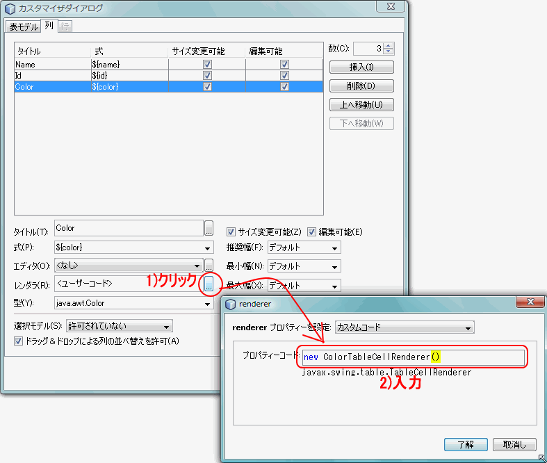 レンダラ欄の右端のボタン[...]をクリックします。すると、rendererダイアログが表示されるので、rendererプロパティーを設定欄のリストボックスから[カスタムコード]を選択します。プロパティーコード欄が空白となっているので、上述で作成したColorTableCellRendererクラスのインスタンスを生成する式を記入します。この設定画面を以下の図4-7に示します。