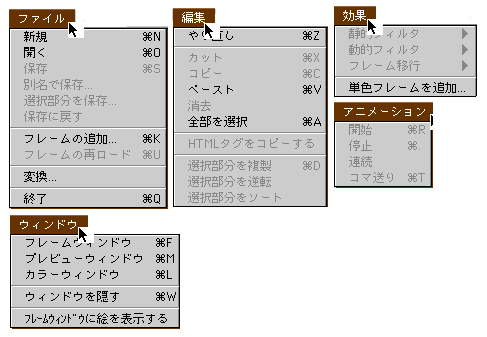 フレームウィンドーで特定のフレームを消去する場合、シフトキーを押しながら編集メニューを選択すると「消去」が「特殊消去」に変わっており、これを選ぶと消去したフレームの時間が合計して前のフレームに追加される。これはコマ落としをする場合には便利な機能。