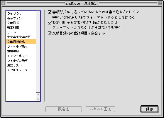 EndNote日本語版活用講座(8) How to use EndNote Japanese Edition [2]2002年3月6日> [1]2002年3月4日 初稿:2002年3月3日 目次に戻るEndNote5日本語版 基本操作マニュアル−2環境設定 いずれのページでも「既定値」「パネルを回復」「保存」のボタンがあるが、そのページで何か変更を行った場合、「既定値」ボタンを押すとデフォールト値に戻される。更に「パネルを回復」を押すと自分が設定したものに戻る。その変更を残したい場合は「保存」ボタンを押すと初期設定ファイルとして保存される。 ライブラリ このページではEndNote5を起動したとき、自動的に読み出すライブラリを登録することが出来る。ここで設定をしていなくても、「ファイルメ」ニューの「ライブラリを開く」でいつでも開くことが出来るが、いつも使うライブラリがある場合はこの設定をしておいた方が便利である。 登録したいライブラリを開いた状態で、「加える」ボタンを押すとそのライブラリが加えられる。 「文献ウィンドウでライブラリ名を表示する」 これをチェックすると下記のように文献ウィンドウのタイトルにそれが属するライブラリ名が表示される。チェックを外すと暫定引用表示になる。 表示フォント ライブラリウィンドウならびに一般表示フォント(すべてのテキスト入力で使われるフォント)を指定する。 ・文献の中に日本語文献が含まれる場合:Osaka等日本語フォントを選択すること。通常のアルファベットはOsakaでも表示できるが、アクセント記号付きの欧文文字は文字化けする。 ・文献が全て欧文でアクセント記号付きの欧文名が含まれる場合:Geneva等の欧文フォントを選択すすること。但し、日本語等は文字化けする。 ・いずれにしてもEndNote5ではフォントの種類が文献データ別で混在できないので、工夫が必要である。[2] 文献形式 規定の文献形式とは、新規文献の作成ウィンドウを開いたときデフォールトで選択されている文献形式である。自分が扱う文献で一番多いものを選択しておけばよい。 文献形式の定義は既存の文献形式を変更したり、新規の文献形式を作成するのに使う。「文献形式を編集する」ボタンを押すと下記のウィンドウが表示される。 文献形式の編集は上級設定に当たるが、本マニュアル内の「日本の投稿規定に合わせた出力するタイルの作り方」この項に詳しく書いてある。 暫定引用 暫定引用とは原稿の引用部分に張り付けられる符号である。EndNoteは原稿をスキャンして、この暫定引用を見つけると、そこに書いてある情報とライブラリの情報をリンクさせ、フォーマット作業を行う。 暫定引用は 開始区切り符号、著者名、年、レコード番号マーカー、レコード番号、閉じ区切り符号 で構成される。 ・暫定用の区切り符号:デフォールトではブレース{ }が使われている。これで挟まれた情報が暫定引用と認識される。この符号は変えてもよいが、その原稿の他の箇所で使われていない符号を選ばなければならい。どうしてもその原稿で、ブレースを使わなければならない場合を除いて、デフォールトのままにするのがよい。 ・レコード番号マーカー:レコード番号の頭に付ける記号でデフォールトは「#」。特に必要がなければ変更する必要はない。 ・レコード番号の代わりにフィールドを使う 一般には使う必要はない。 ・引用接頭子マーカー:表示例にあるように、引用にテキストを加える場合に、テキストとの区分に使用する。 ・注釈の表示:EndNoteでは文献からの引用以外に、自分で注釈を引用の代わりに付けることが出来る。そのときの表示を指定する。ここでは「NOTE:」となっているため{NOTE: This theory is still under study.} と引用部分に書くと、この部分も文献番号がつけられ文献目録に記載される。 日本語文献の場合は「註:」としてもよい。 ソート ソートの条件設定は「文献」メニューの「ソート」で行い、ここでは、ソートを行う時に無視する単語を規定する。 Charles de Gaulle, Herbert von Karajanなど、欧文名には古い貴族名に由来する前置詞がついた姓が多いが、通常、名簿の並び順ではこれを除外する。 タイトルフィールドでは論文名の冠詞を除外してソートを行うように指示できる。 大文字小文字変更 EndNote5には強力なテキスト分析機能があり、著者名の大文字小文字の変更、タイトルを全て大文字で出力させるなどの指定が出来る。 ここでは大文字小文字の変更をしてもらっては困る単語を登録しておく。 文献目録作成 フィールド表示 ライブラリウィンドウでは5つまでの項目を表示できる。 このページで表示する項目と順番を設定できる。項目名はユーザーが自由に設定できる。 重複項目 文献メニューの「重複項目の検索」やする場合に使うほか、EndNote5にはインターネットからファイルをダウンロードする場合、既にライブラリにある項目を自動的にチェックして重複を防ぐ機能がある。そのときに、どの項目の重複をチェックするかを指定する。 あまり増やすと処理速度が遅くなるので通常はデフォー